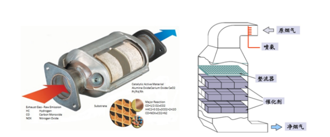 如下图所示为汽车排气管三元催化反应器、火电厂烟气脱硝反应处理装置示意图。