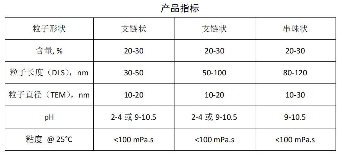 支链状硅溶胶是一种由10-20nm二氧化硅初级粒子通过交联形成的支链状纳米二氧化硅分散液。结构决定性能,这些形貌不同的硅溶胶有不同的使用性能,例如支链状、串珠状的硅溶胶在干燥成膜过程中粒子之间会相互交叉搭接,其成膜性能明显好于普通球形硅溶胶。另外,支链状的纳米二氧化硅粒子可以在基材表面形成微观粗糙结构,可用于制备超亲水、超疏水等特种涂层。另外,还可以用于水性木器漆等水性涂料领域,用于提高涂层的硬度。